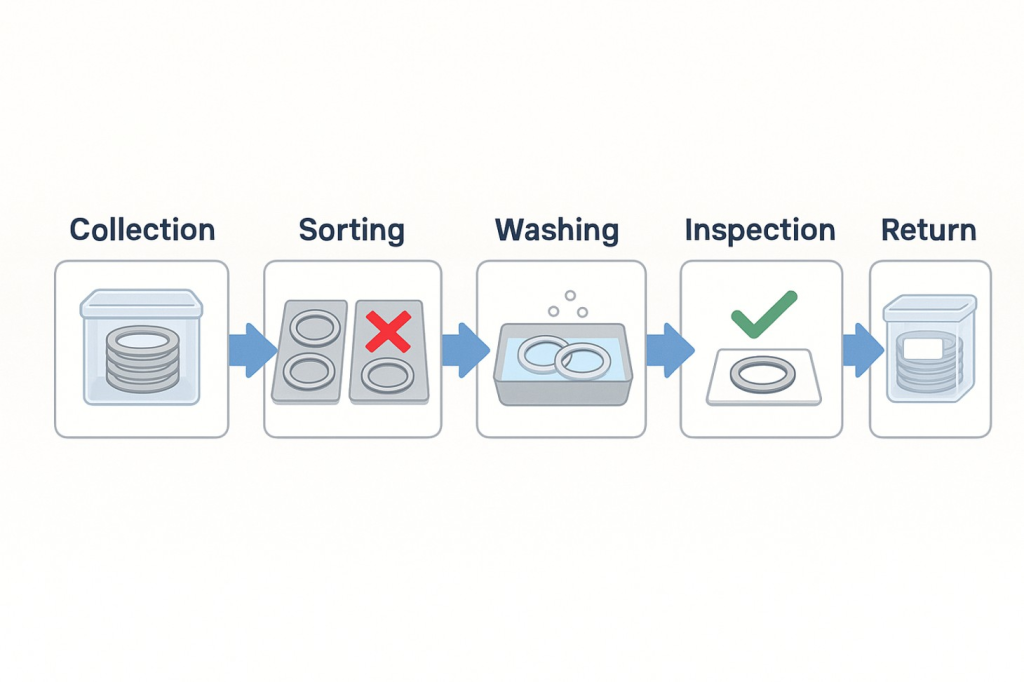 Teams often use the terms loosely. In practice, washing and refurbishment keep rings in use, while recycling is what happens when rings are no longer fit for safe reuse. A strong programme treats both as parts of one controlled loop, with clear reject rules.