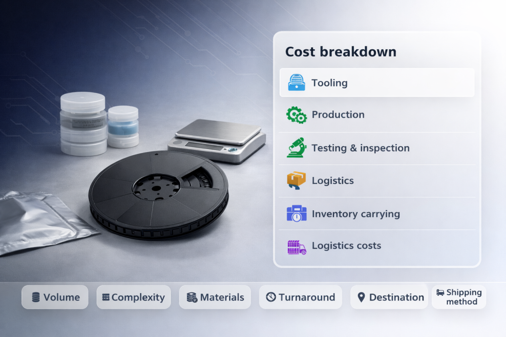 - Tooling costs – One-time charges for carrier tape molds and dies. Costs vary from several hundred to several thousand dollars depending on complexity.