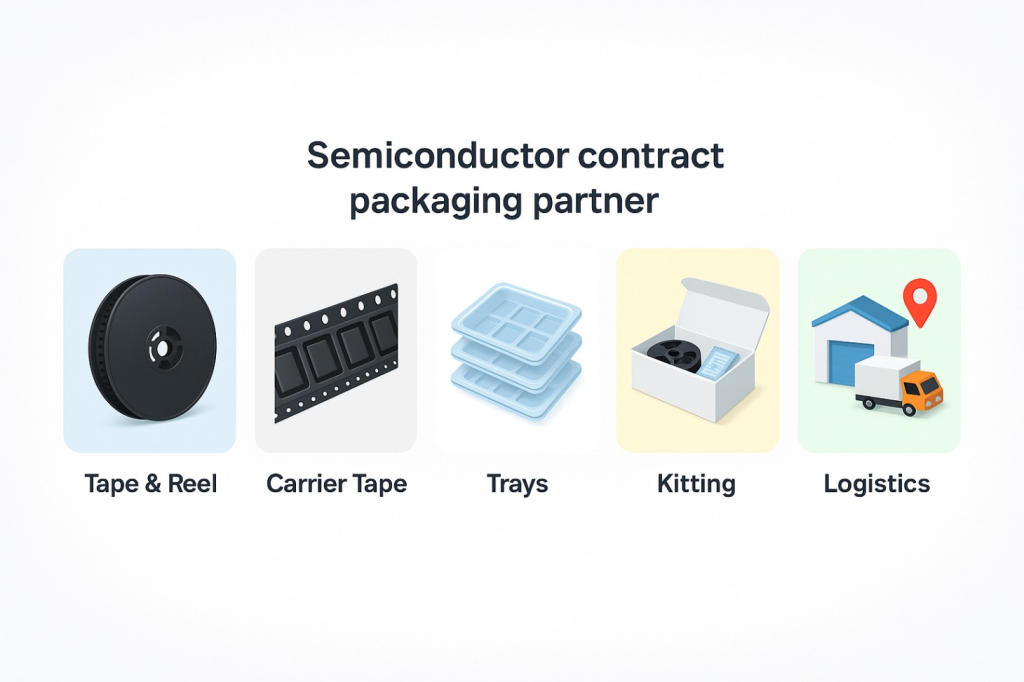 This approach differs from wafer-level services provided by OSAT (Outsourced Semiconductor Assembly and Test) providers that handle die attach, wire bonding, and electrical testing. Contract packaging partners focus on component-level packaging for finished semiconductor devices, including tape and reel, thermoformed trays, carrier tape, kitting, and supply chain services.